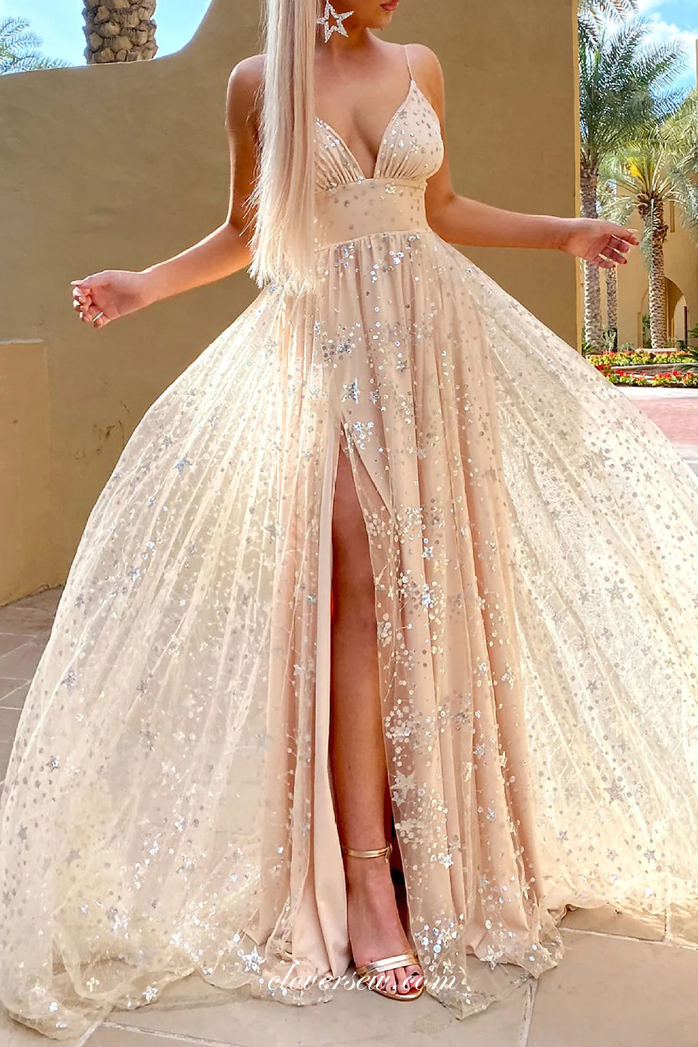 Gold Champagne Star Sequined Tulle A Line With High Slit Prom Dresses Clover Sew